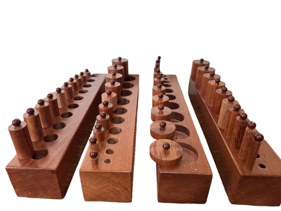 4 barras de madeira , cada uma com 10 colindros de tamanhos e espessuras diferentes.