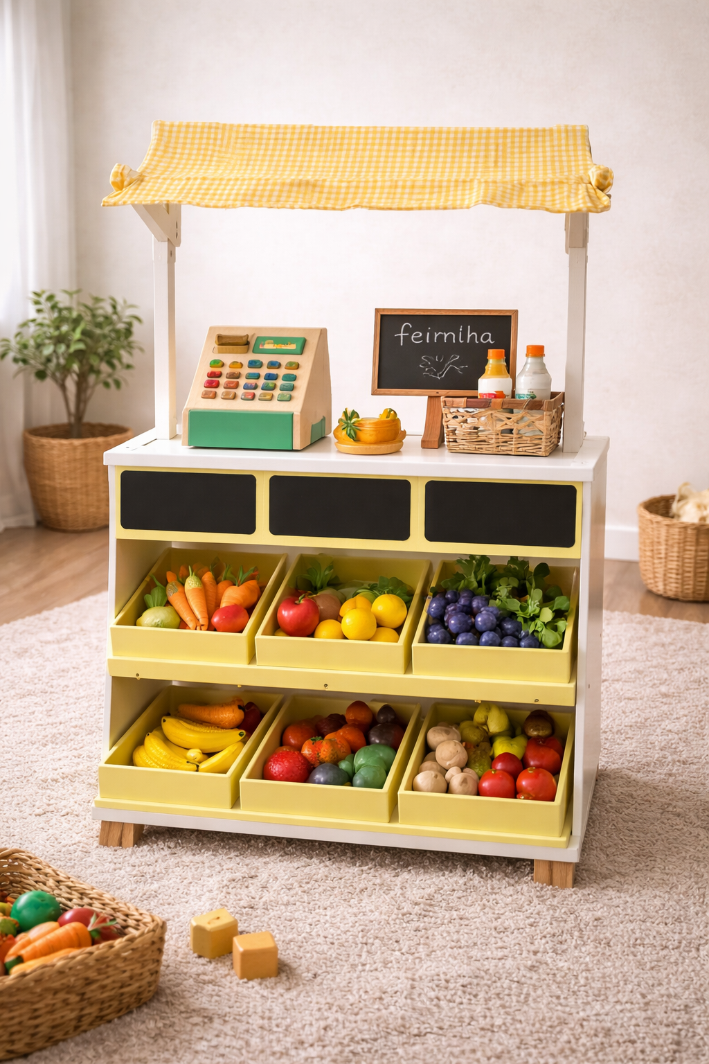 A feirinha infantil de madeira é um brinquedo educativo que transforma a brincadeira em uma experiência real de mercado, permitindo que a criança simule compras, organize produtos e interaja com outras crianças.